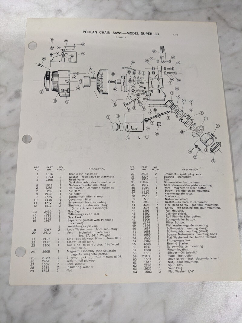 Poulan Illustrated Service Parts List Manual Catalog Chainsaws Super 33 1971
