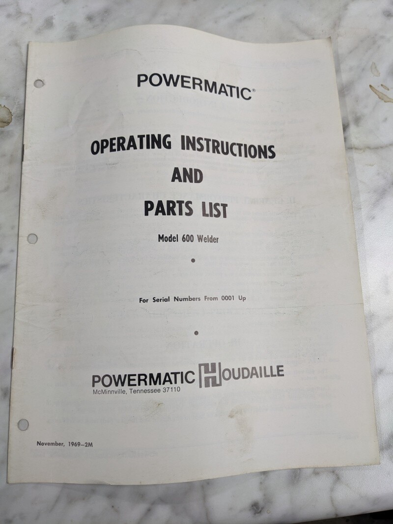 Powermatic Operating Instruction Manual & Parts List Model 600 Welder 1969
