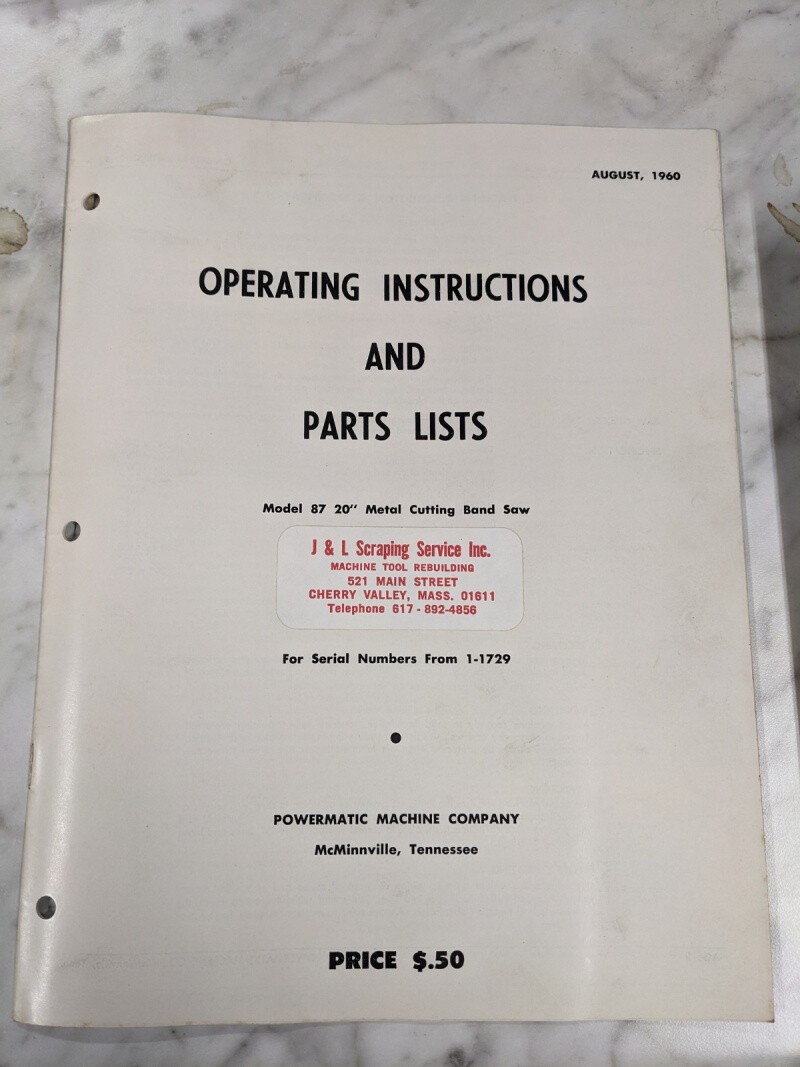Powermatic Operator Instruction Manual Parts Catalog Model 87 20” Band Saw