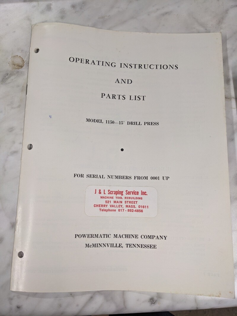 Powermatic Operator Instruction Manual & Parts List 15” Drill Press Model 1150