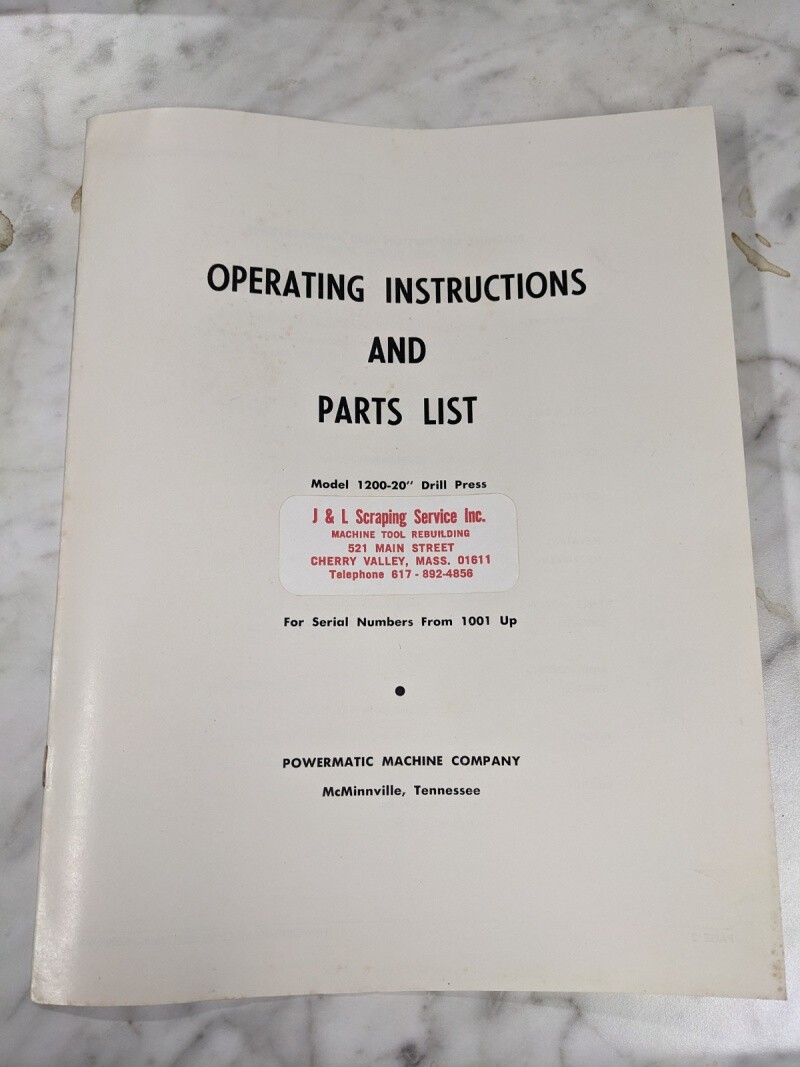 Powermatic Operator Instruction Manual & Parts List Model 1200 20” Drill Press