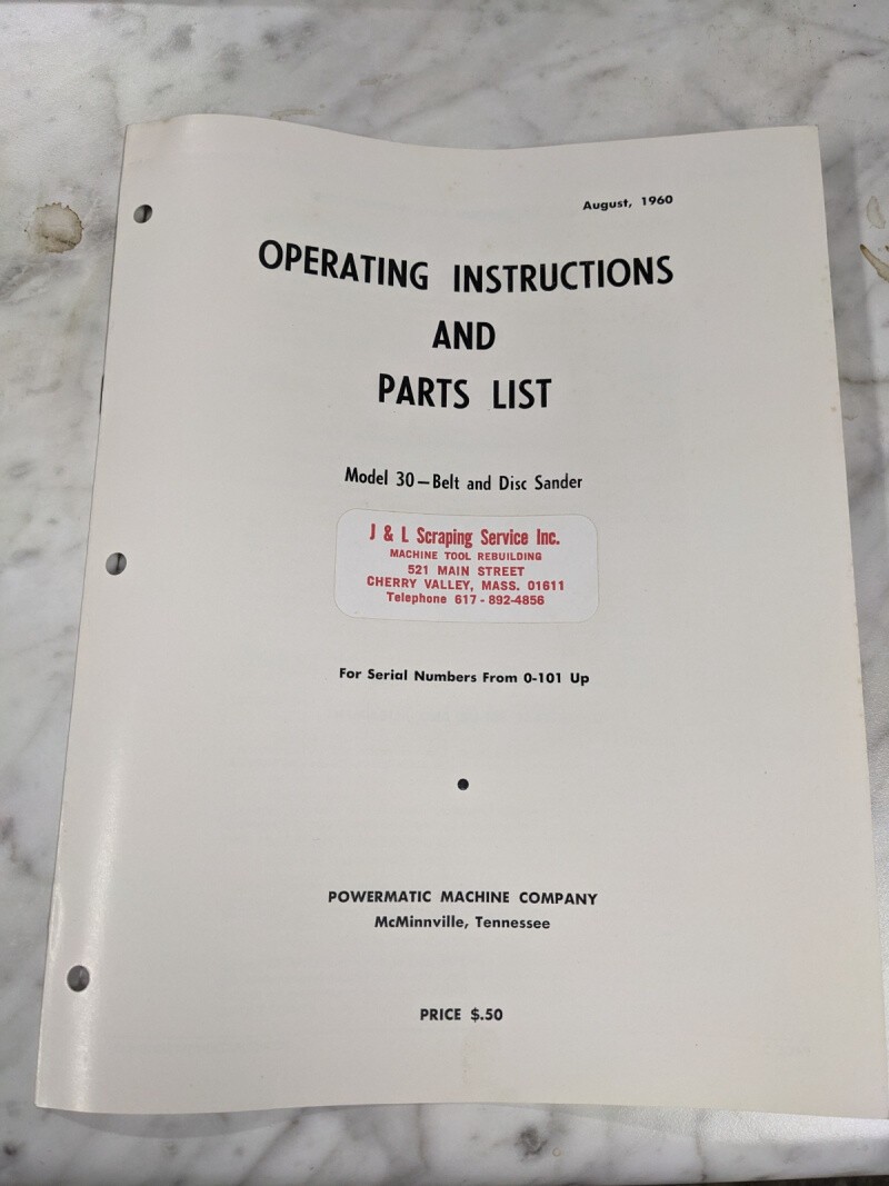 Powermatic Operator Instruction Manual & Parts List Model 30 Belt Disc Sander
