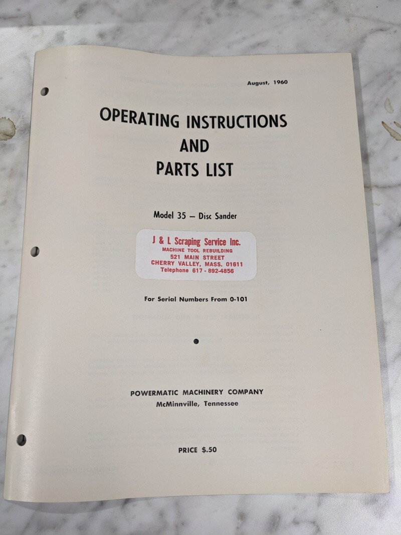 Powermatic Operator Instruction Manual & Parts List Model 35 Disc Sander 0-101