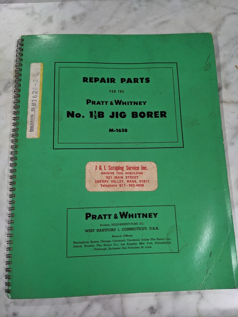 Pratt Whitney 1-1/2B Jig Borer Service Repair Parts List Manual M-1628 Machine