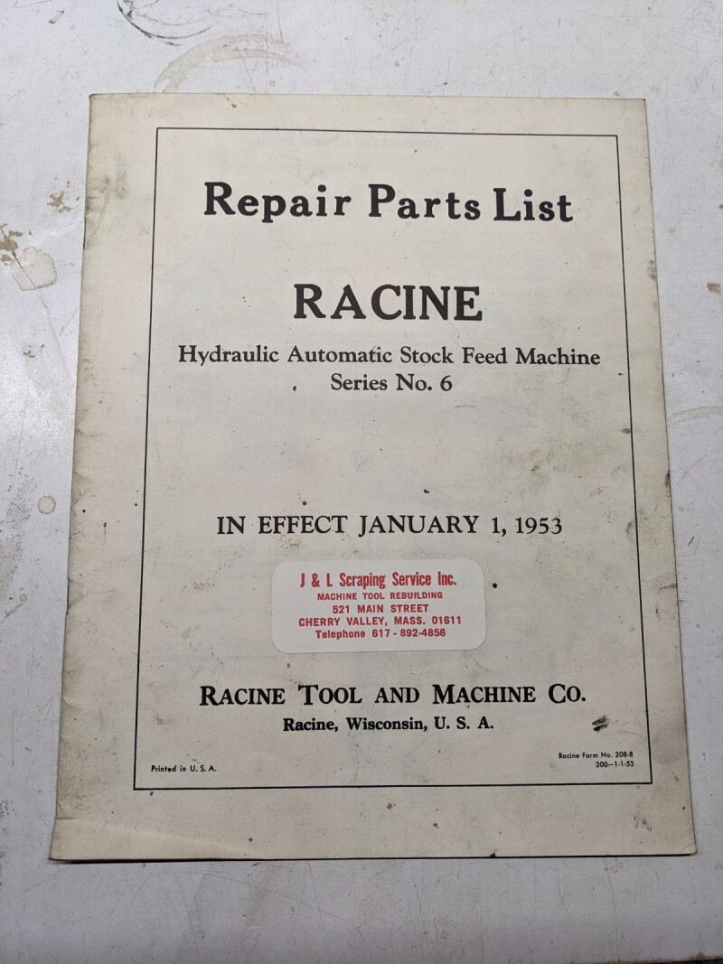 Racine Tool Machine Service Repair Parts List Manual #6 Stock Feed Automatic