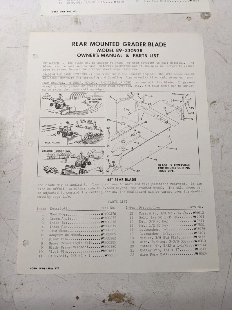 Rear Mounted Grader Blade Model 89-33093R Owners Manual Parts List Book