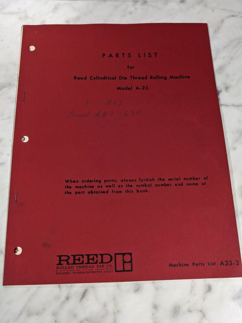 Reed Service Parts List Book Manual Catalog Die Thread Rolling Machine A-23