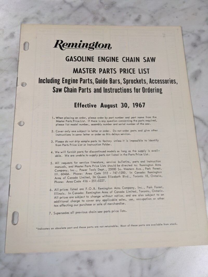 Remington Gasoline Engine Chain Saws Master Parts Price List 1967 Dealer Sales