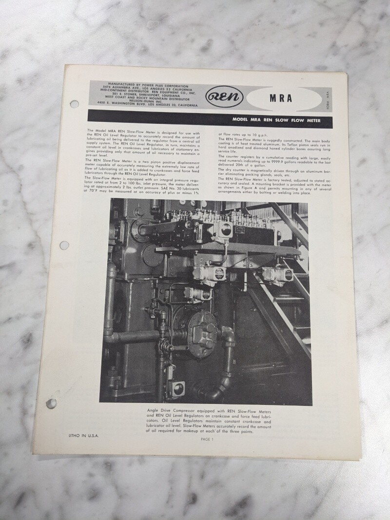 Ren Oil Level Regulator Owner Manual Part List Mra Slow Flow Meter