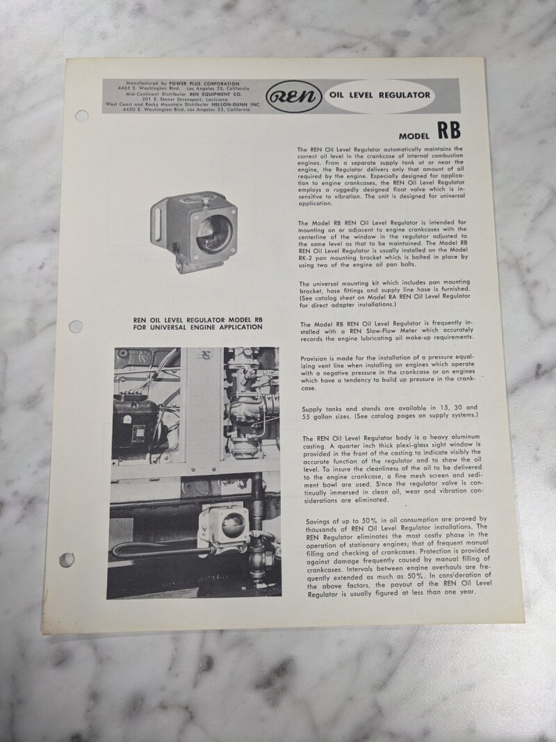Ren Oil Level Regulator Owner Manual Specifications Model Rb