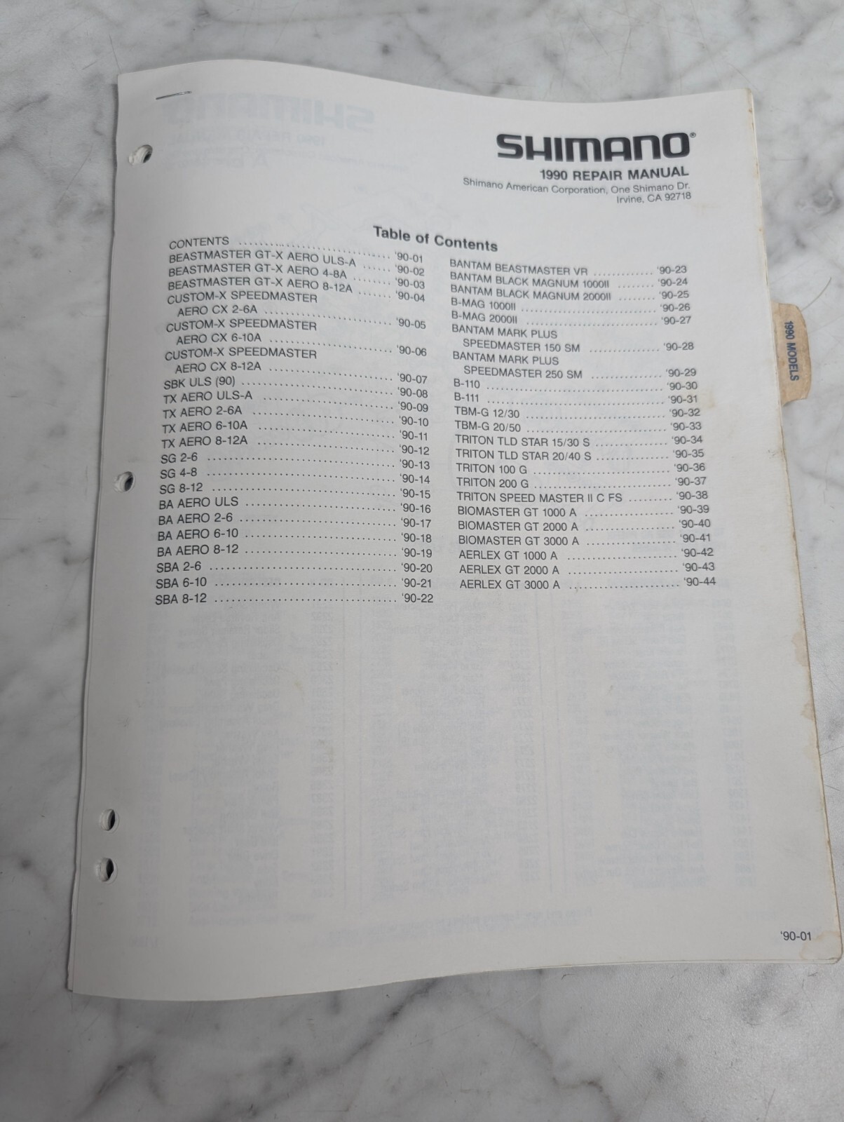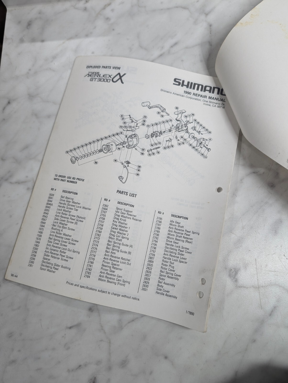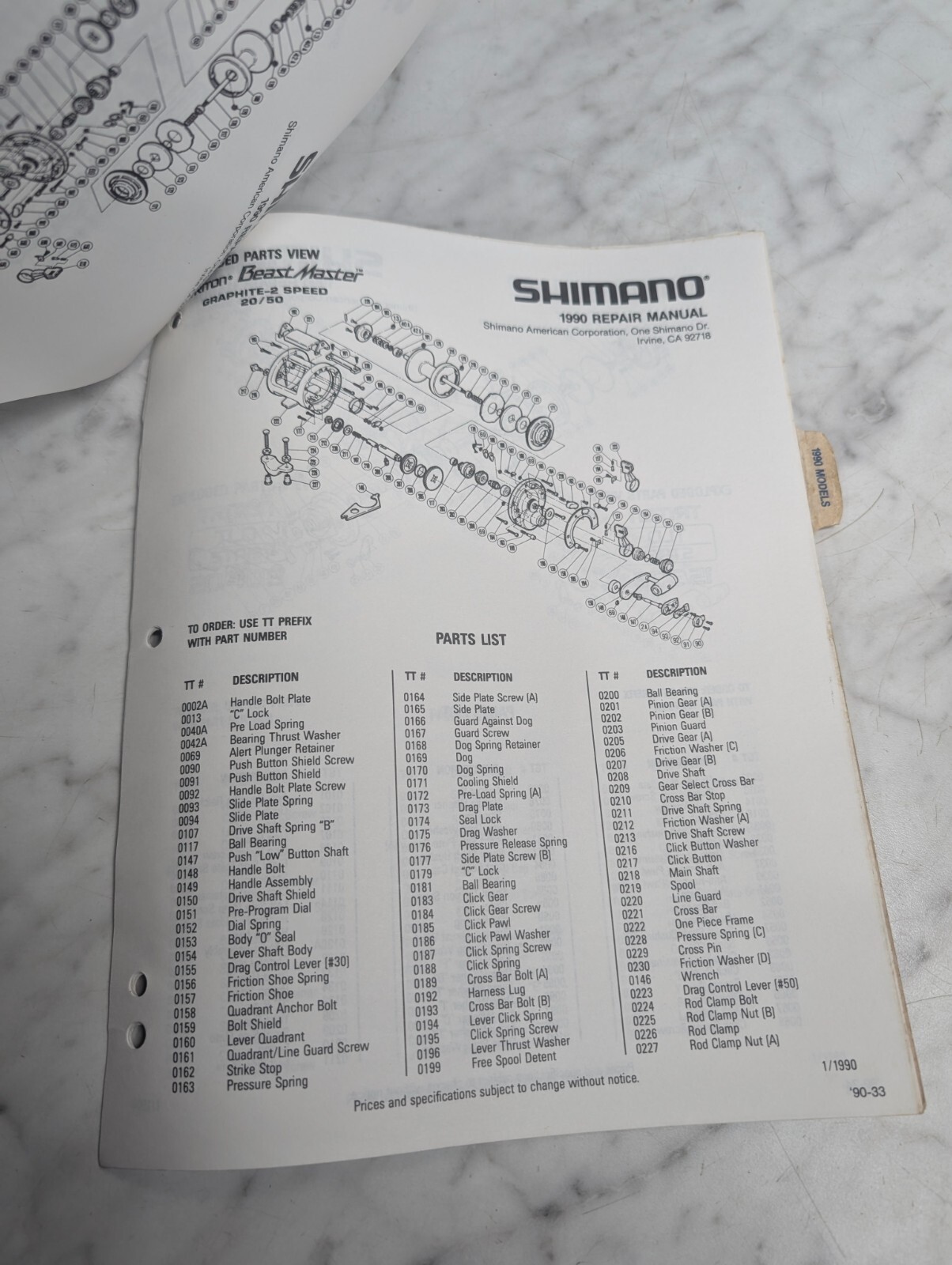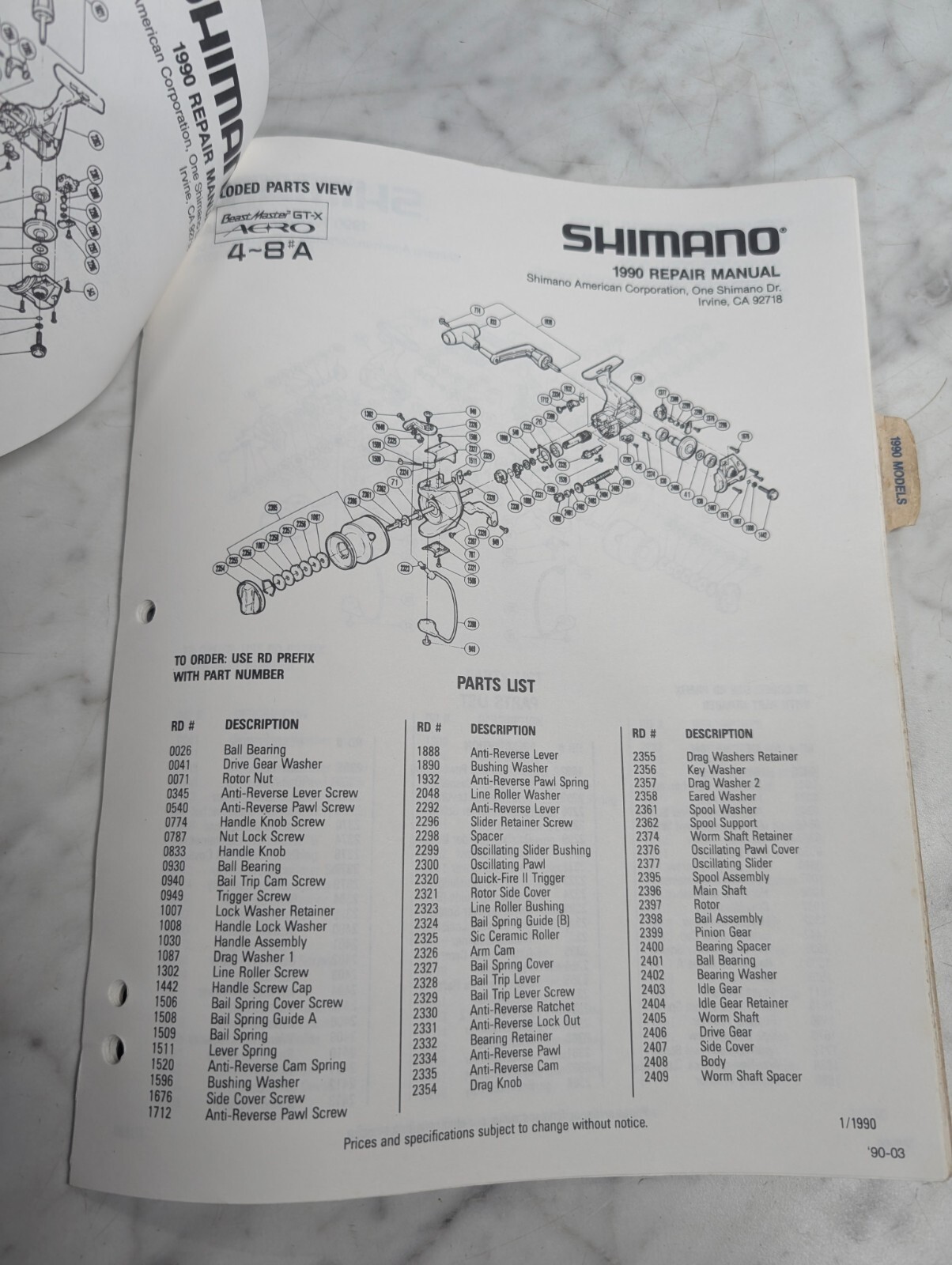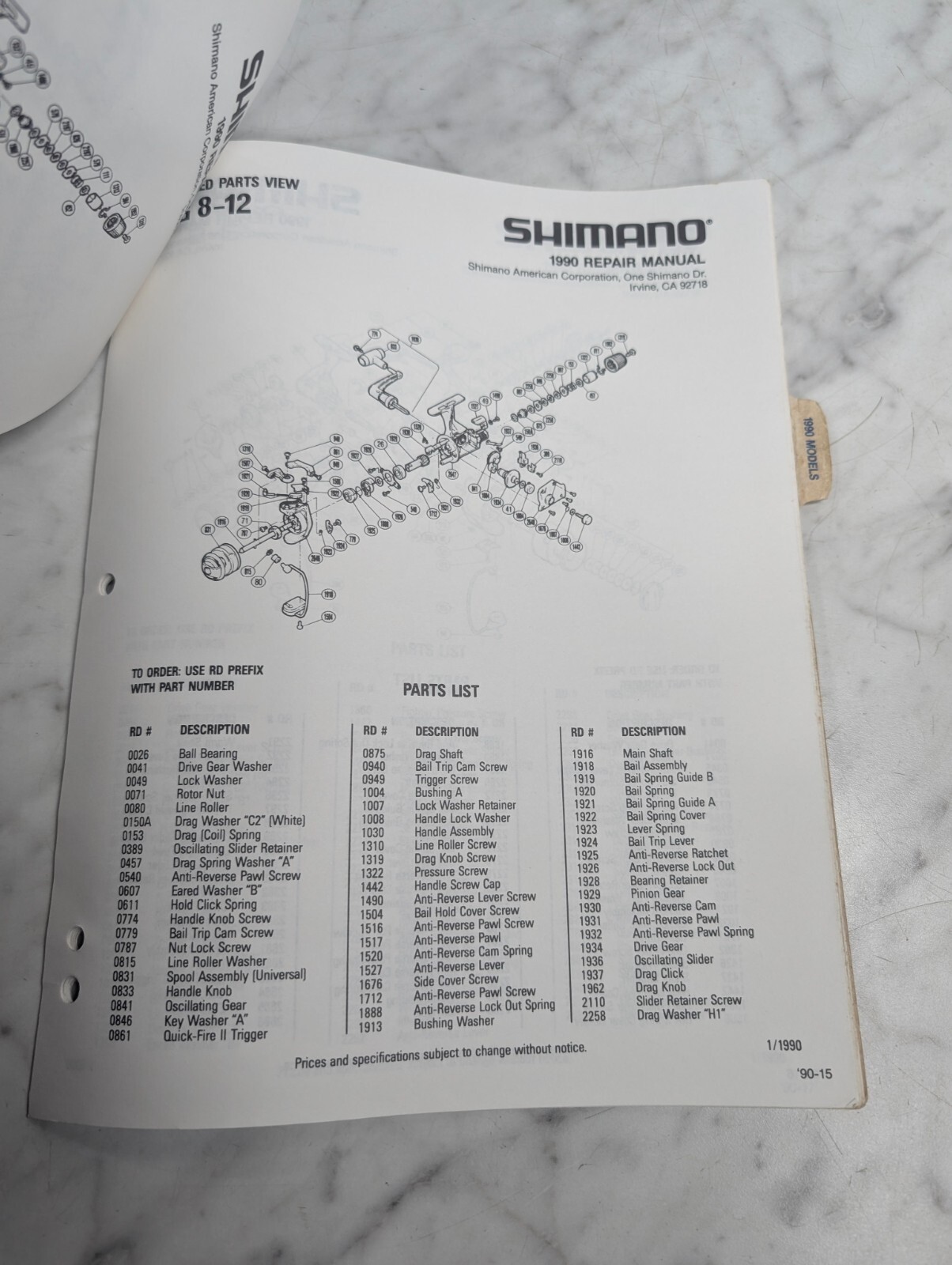 Repair/Service Parts List Book Catalog Manual Fishing Reels 1990 Shimano