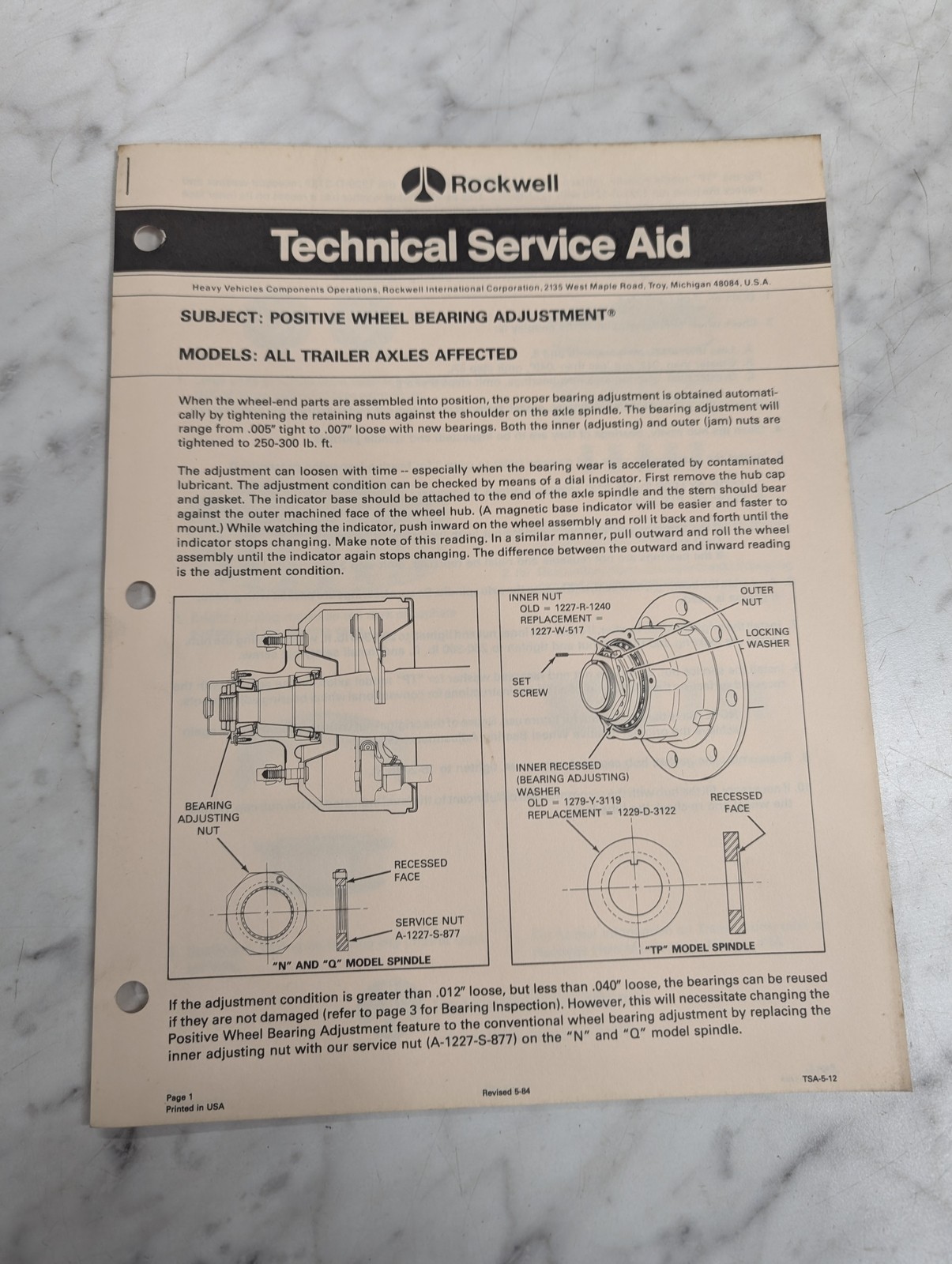 Rockwell Technical Service Aid Bulletin 1984 Positive Wheel Bearing Adjustment