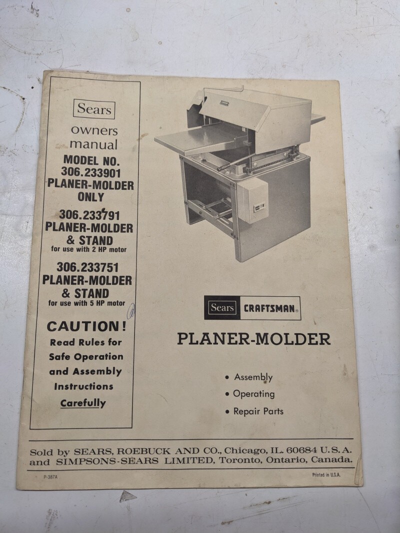 Sears Owners Manual 306.233901 Planer Molder Parts List Operating Book P387A