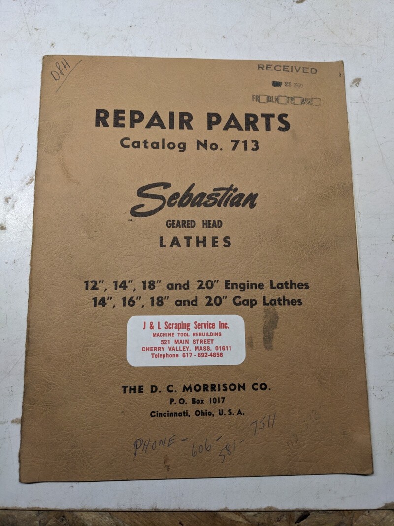 Sebastian Repair Parts List Book Manual Catalog Engine Gap Lathe 12-20” 1950