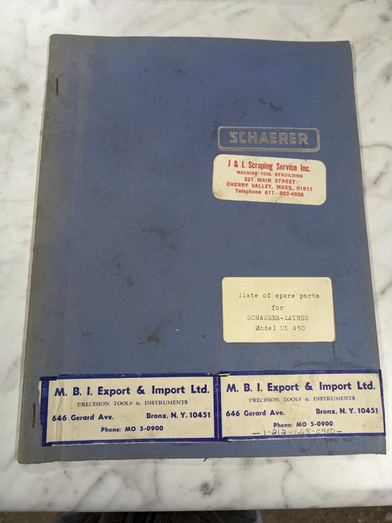 Shaerer Service Parts List Book Manual Catalog Lathes Model Un 450 Machine Tool