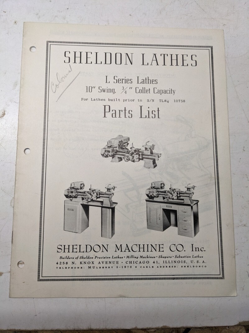 Sheldon Machine Parts List Book Manual Catalog L Series 10” Lathes 3/4” Collet