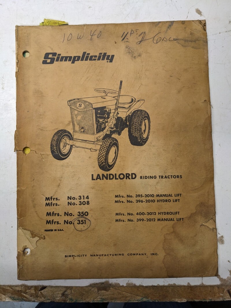 Simplicity Landlord Tractor 314 308 350 351 Operation Parts List Manual Book