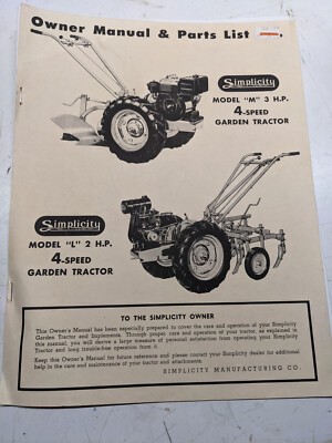 Simplicity Model M L Walking Garden Tractor Owners Manual & Parts List Book