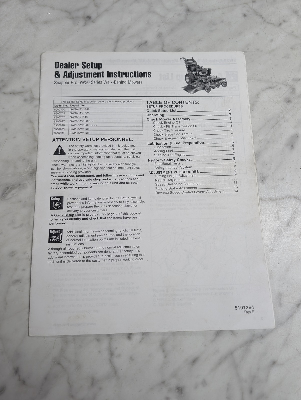 Snapper Pro Sw20 Series Walk-Behind Mowers Dealer Setup Adjustment Instructions