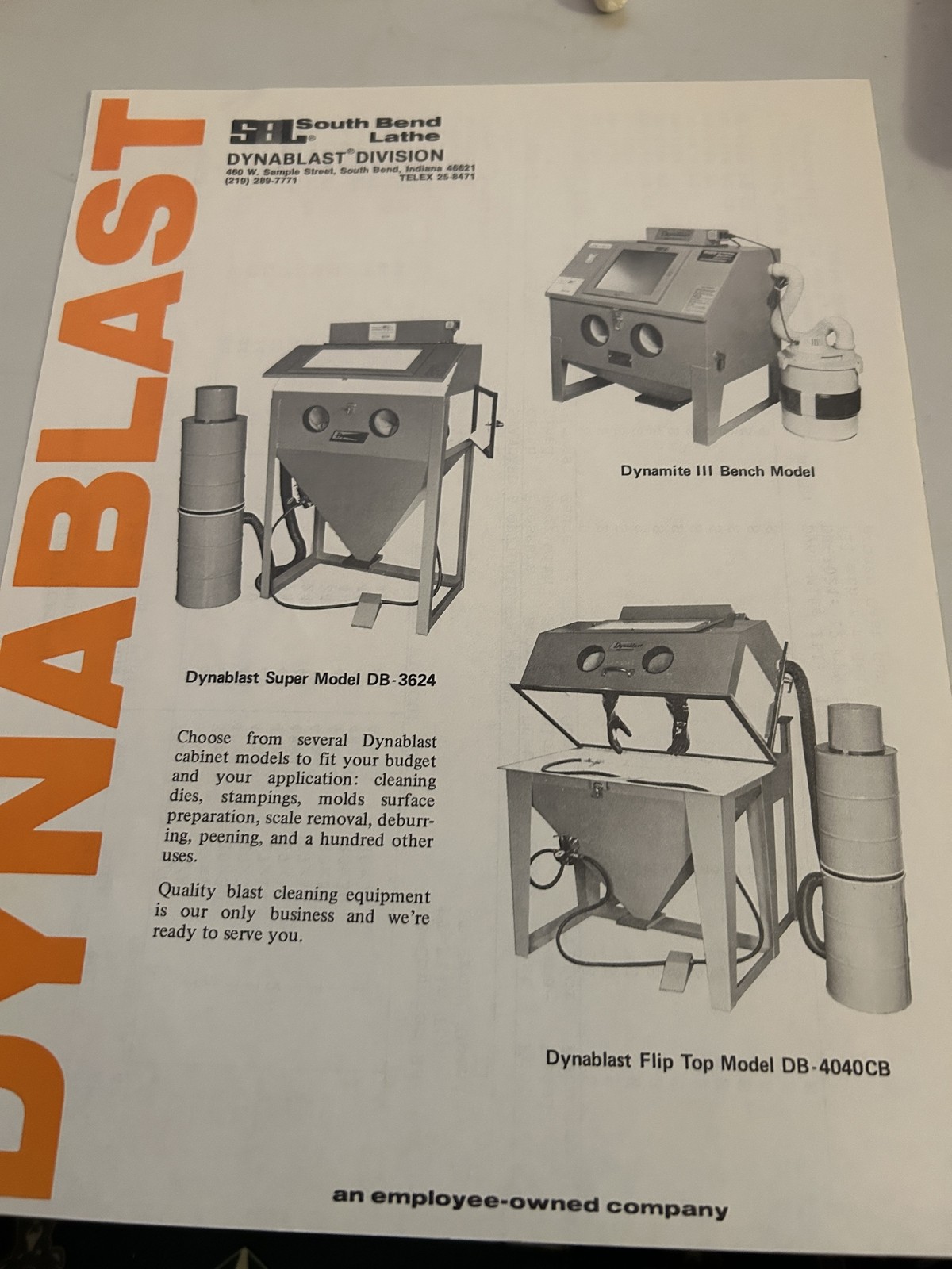 South Bend Lathe Dynablast Division Db-3624 Db-4040Cb Sales Brochure Model Sheet