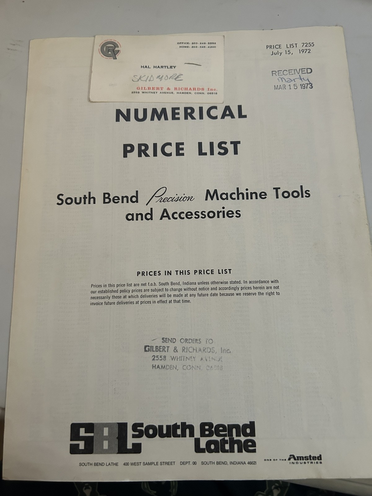 South Bend Lathe Numerical Price List South Bend Precision Machine Tools 1972