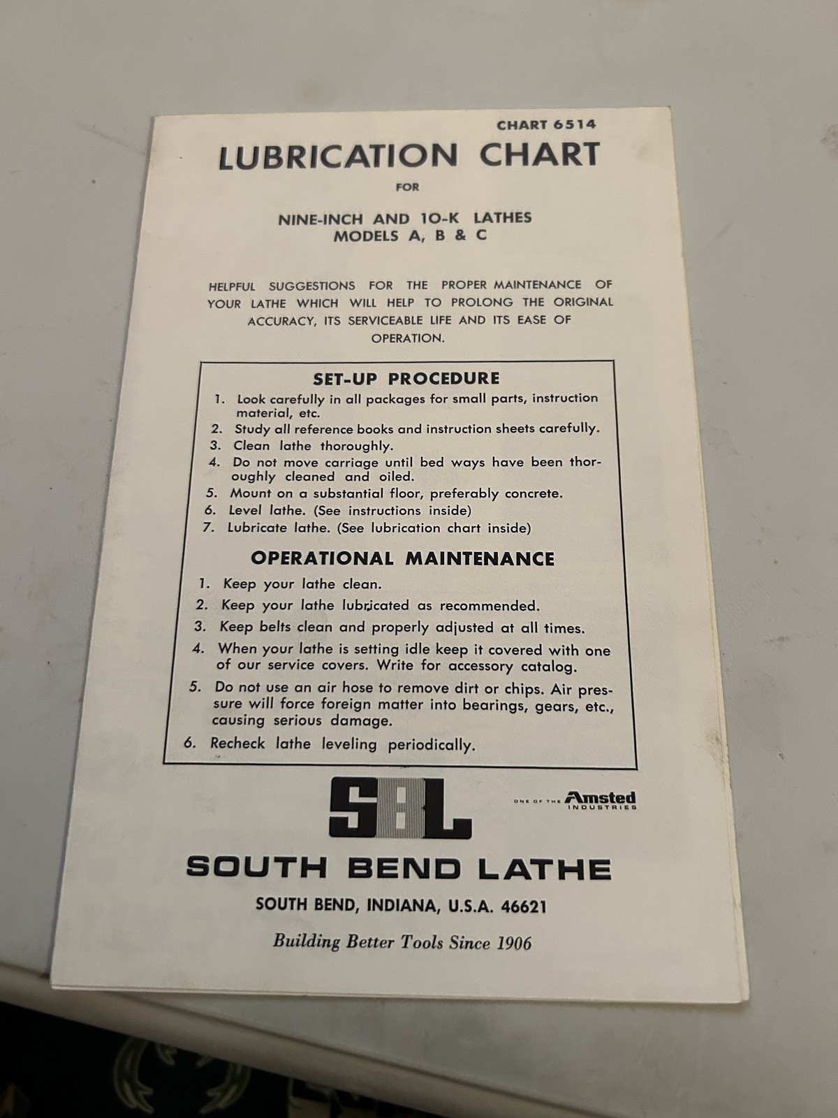 South Bend Lathe Works Lubrication Chart For 9″ 10-K Lathes Models A,B,C