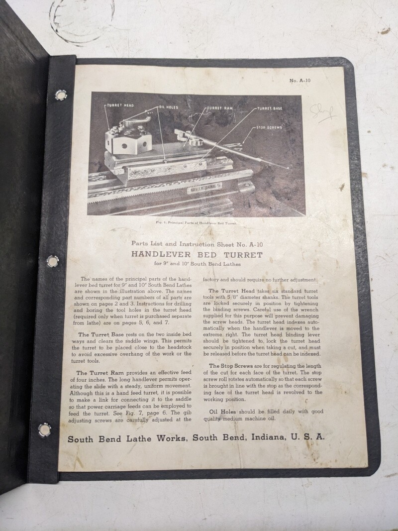 South Bend Lathes Operator Manual Parts List Book 9 & 10” Bed Turret 1943