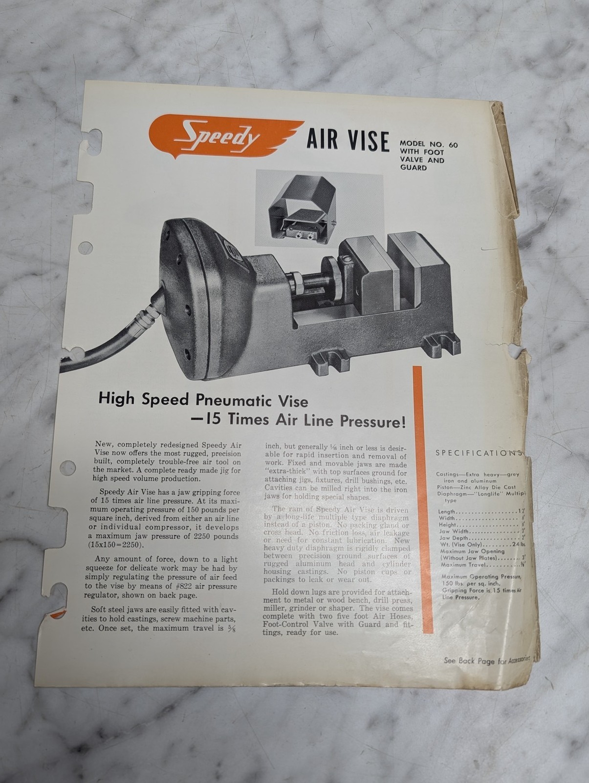 Speedy Air Vise Model #60 High Speed Pneumatic Sales Specifications Sheet