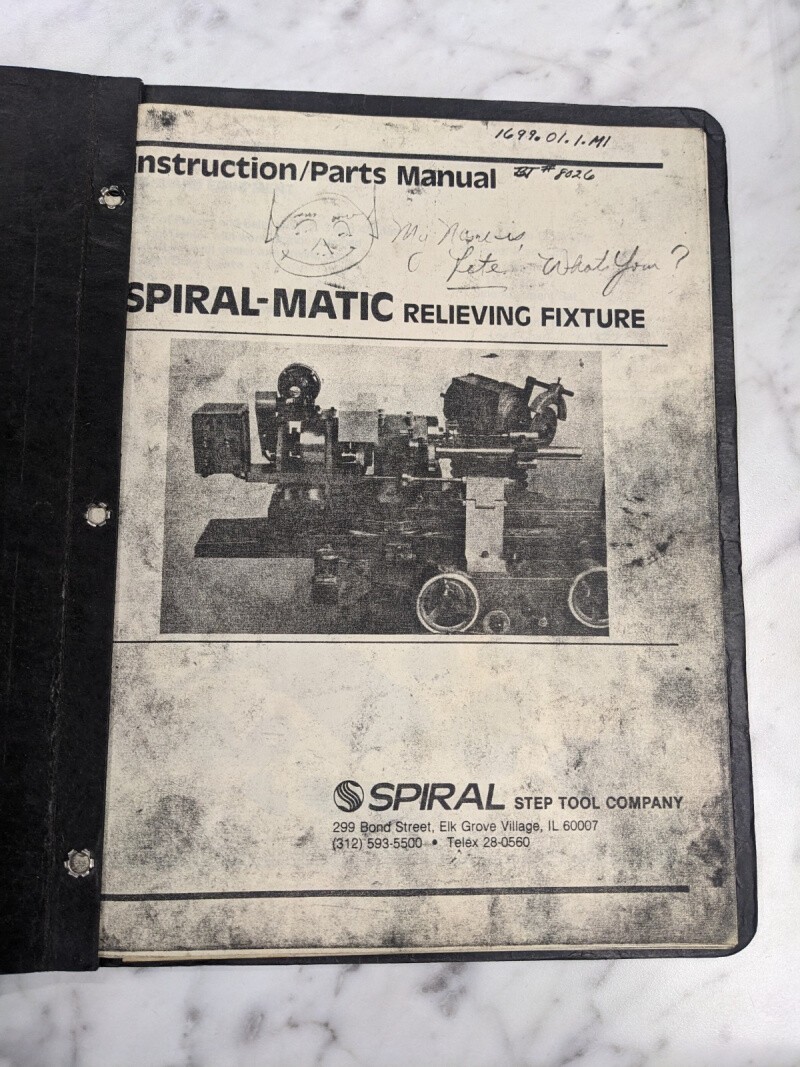 Spiral Tool Spiral-Matic Relieving Fixture Instruction Service Manual Parts Book