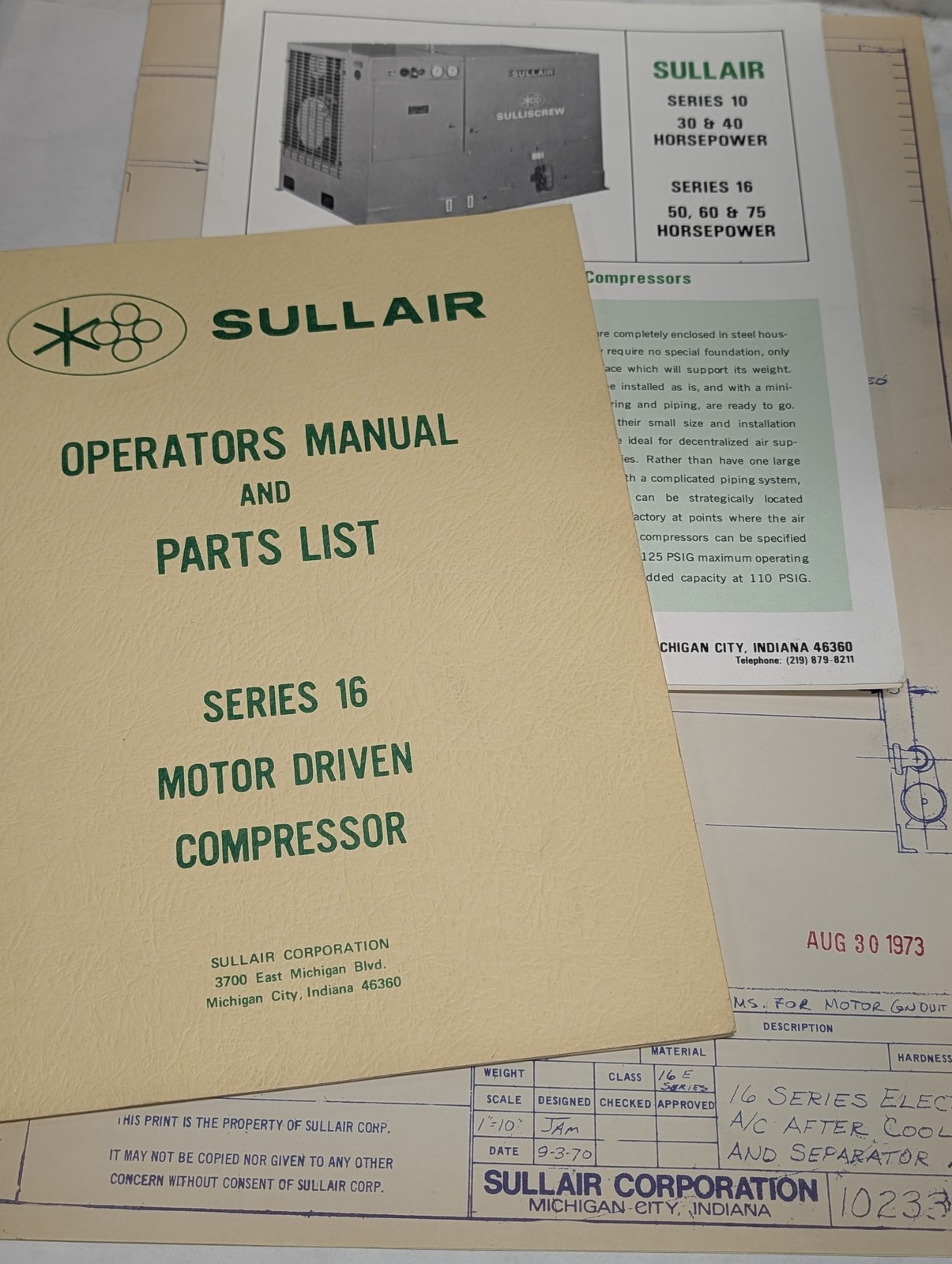 Sullair Operators Manual Parts List Catalog Series 16 Air Compressor