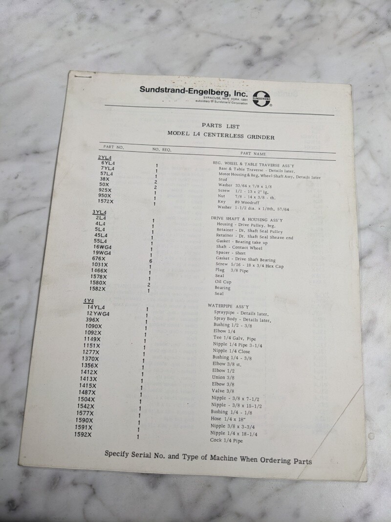 Sundstrand Illustrated Service List Parts Manual Model L4 Centerless Grinder