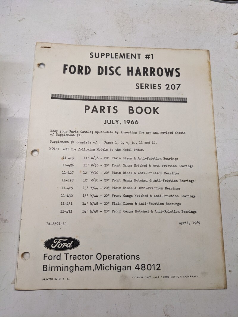 Supplement #1 Ford Disc Harrow 207 Series 11-425 11-432 Parts List Manual 1966