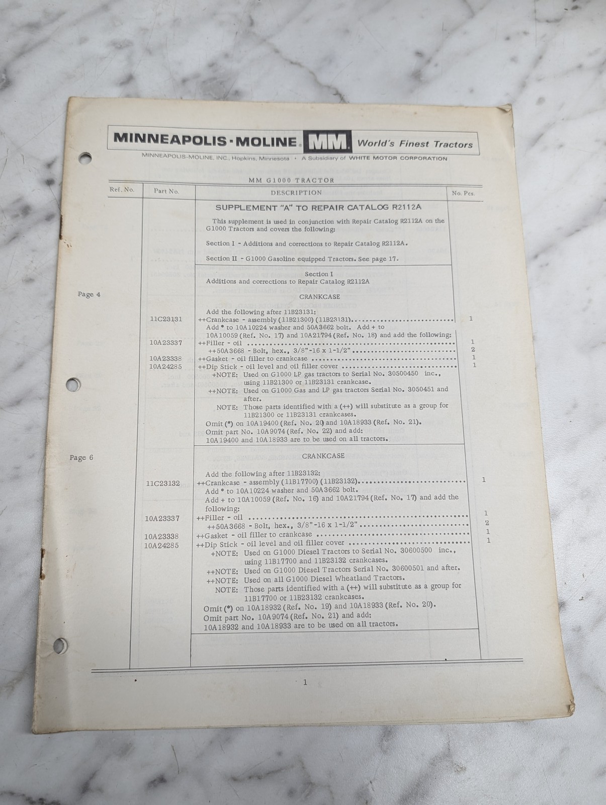 Supplement Manual “A” Only – Minneapolis Moline Mm G1000 Tractor – For R2112A