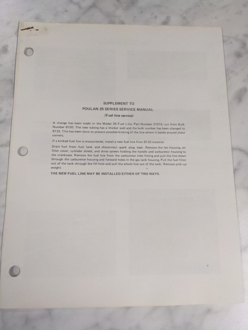 Supplement Service Repair Manual Poulan 25 Series Chainsaw Fuel Line Service