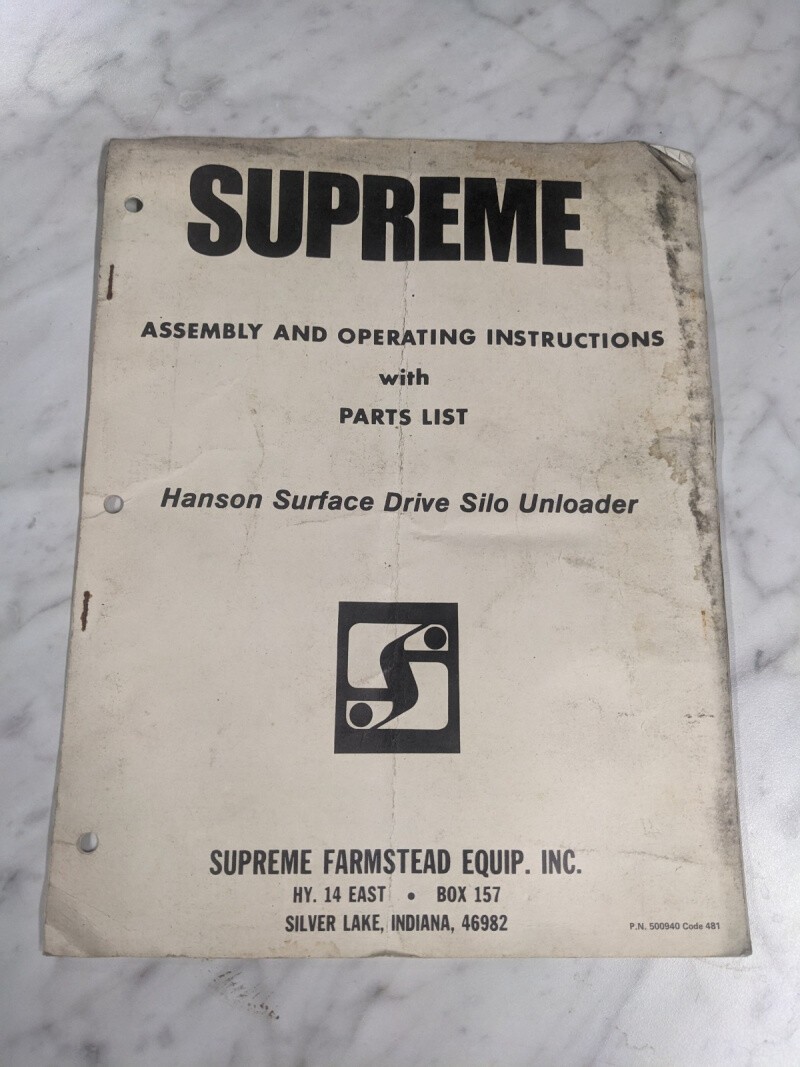 Supreme Farmstead Operator’S Service Manual Parts List Silo Unloader Hanson