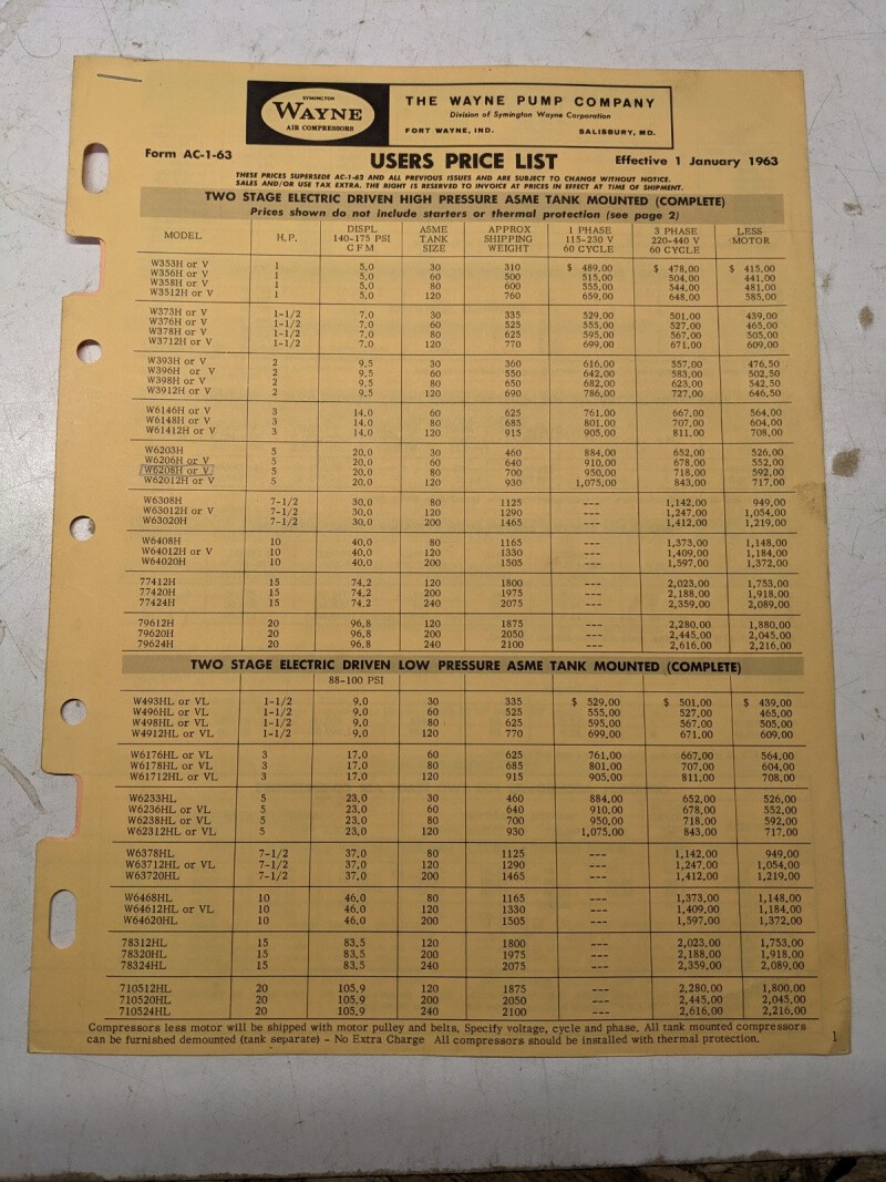 Symington Wayne Pump Sales Brochure Catalog Price List 1963 Air Compressor