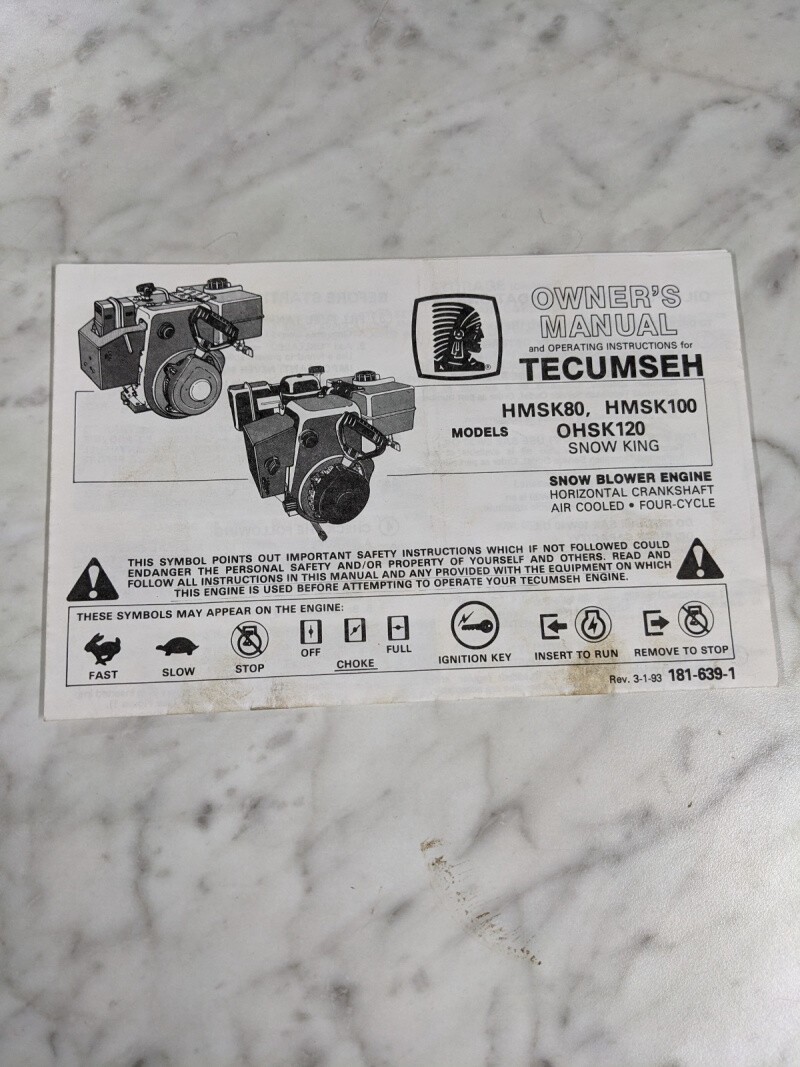 Tecumseh Owner’S Operation Manual Hmsk80 Hmsk100 Hmsk120 Snow King 1993