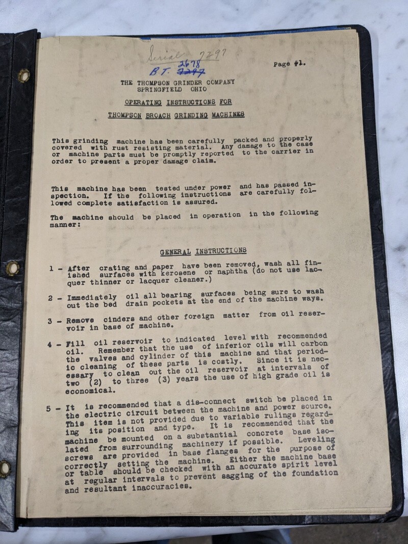 Thompson Broach Grinding Machine Operator Instruction Manual Book 6X48” Shop
