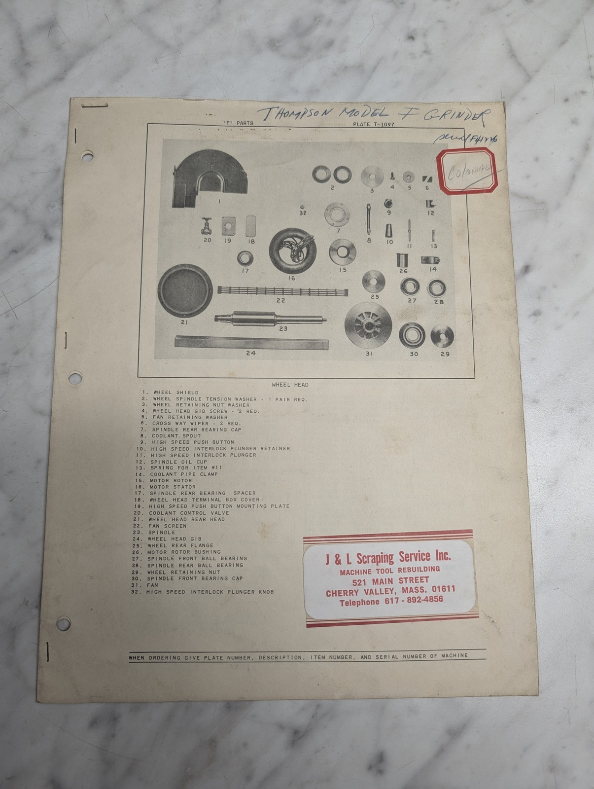 Thompson Model F Grinder Parts List Book Manual Catalog T-1097 5 Pages