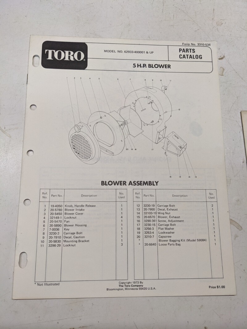 Toro 5Hp Blower Parts Catalog 1973 62933 3310-534 List Book Manual