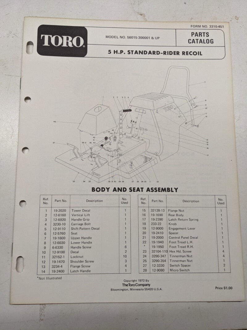 Toro 5Hp Parts Catalog List Manual Lawn Tractor Standard Rider 56015 1972