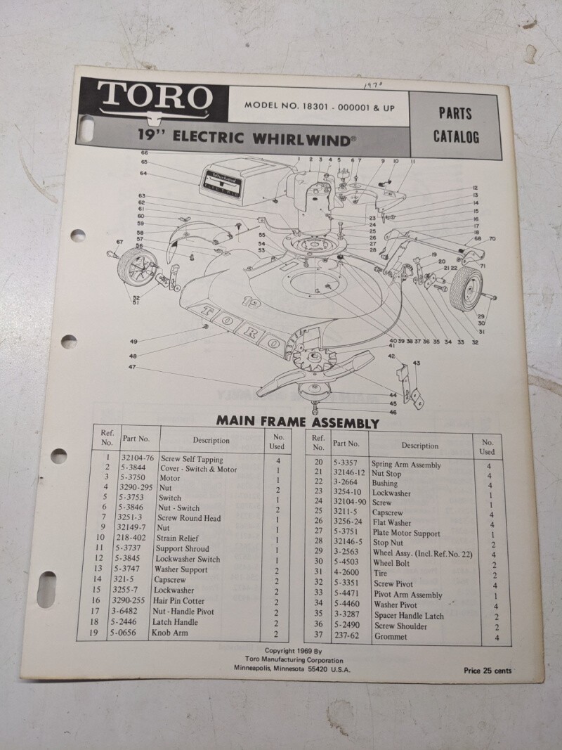 Toro Parts Catalog List Book Manual 19” Electric Whirlwind 18301 1969 Mower Lawn