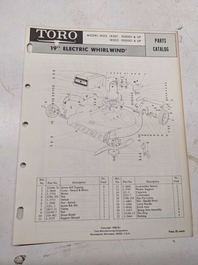 Toro Parts Catalog List Book Manual 19” Whirlwind Electric Mower 18301 18302 68