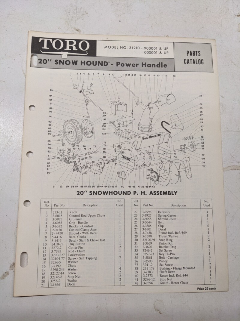 Toro Parts Catalog List Book Manual 20” Snow Hound Power Handle 31210 900001