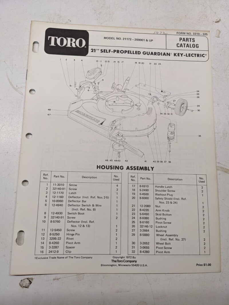 Toro Parts Catalog List Book Manual 21” Guardian Mower 21172 Key Lectric 1972
