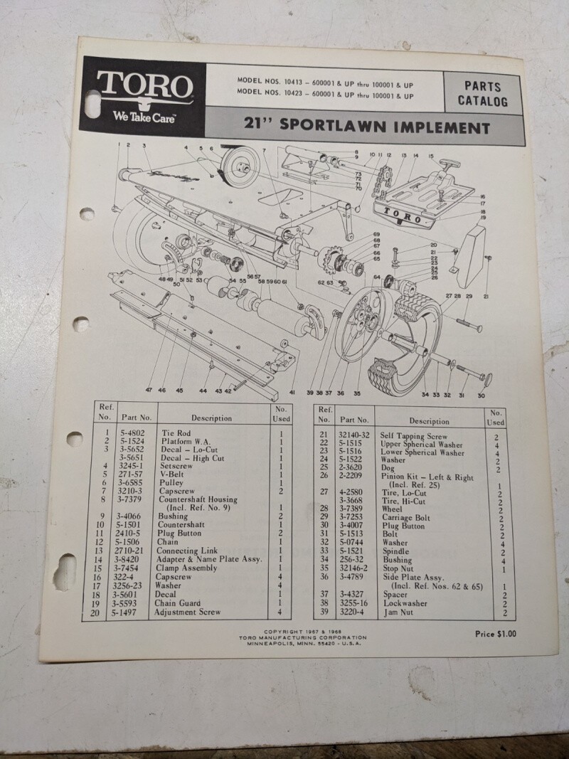 Toro Parts Catalog List Book Manual 21” Sportlawn Implement 10413 10423 1968