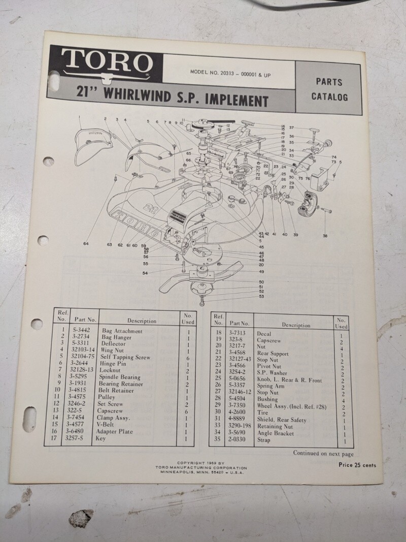 Toro Parts Catalog List Book Manual 21” Whirlwind Sp Implement 20313 1969