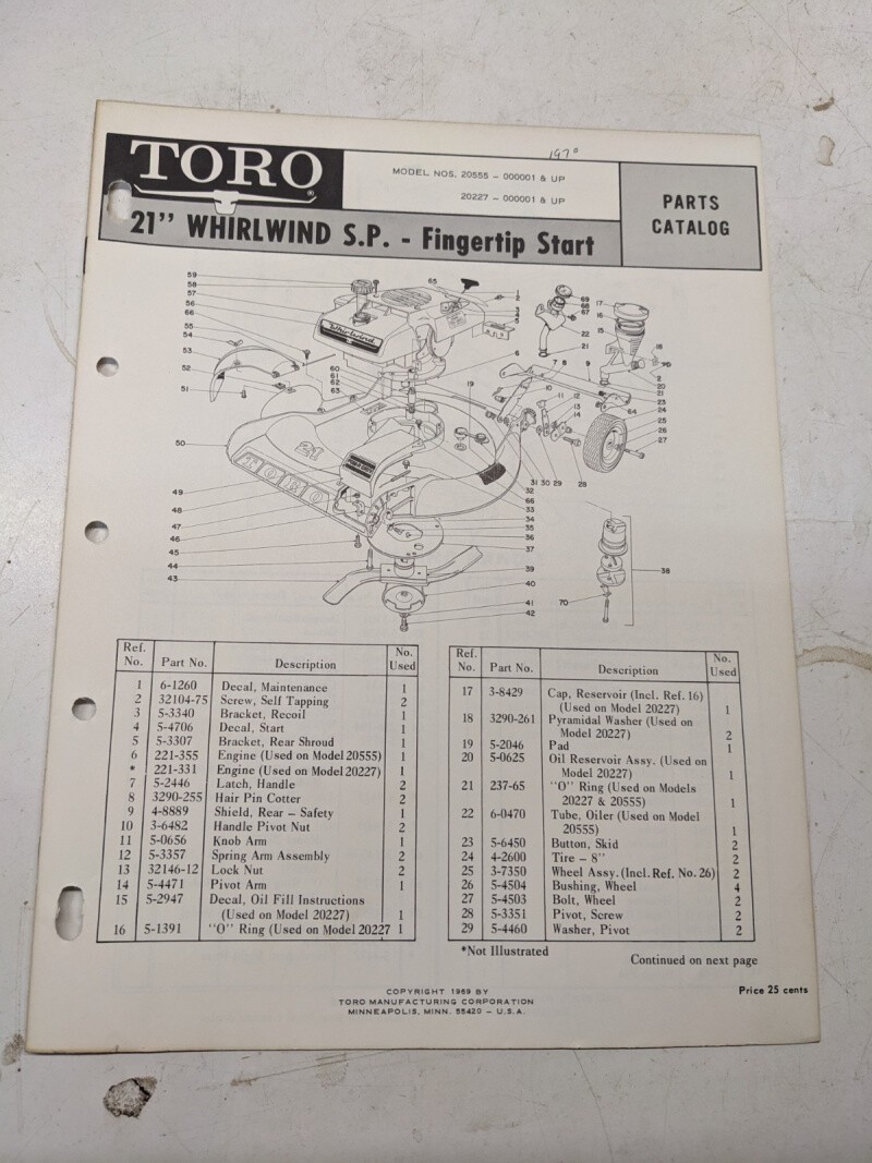 Toro Parts Catalog List Book Manual 21” Whirlwind Sp Lawn Mower 20555 20227 1969