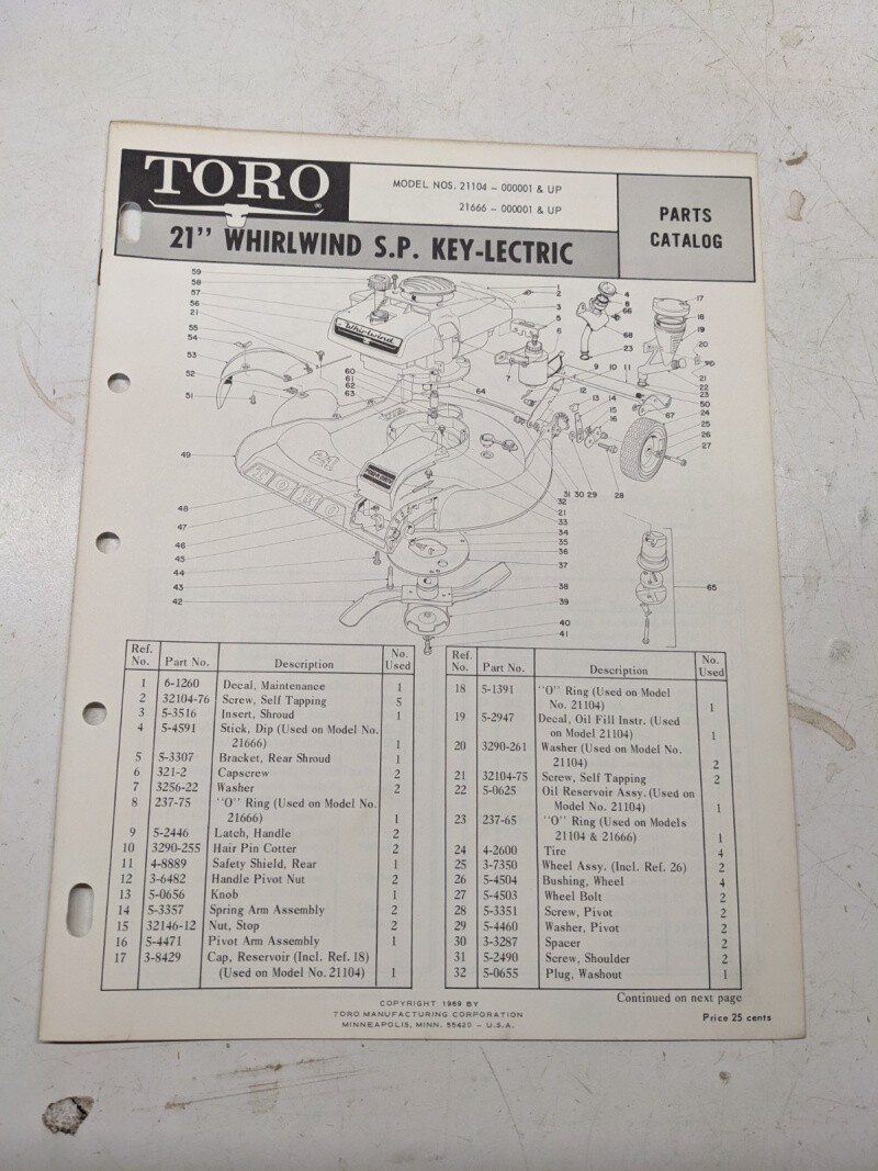 Toro Parts Catalog List Book Manual 21” Whirlwind Sp Lawn Mower 21104 21666 1969