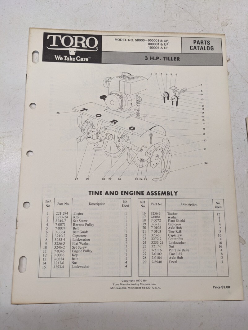 Toro Parts Catalog List Book Manual 3Hp Tiller 58000 1970 Garden